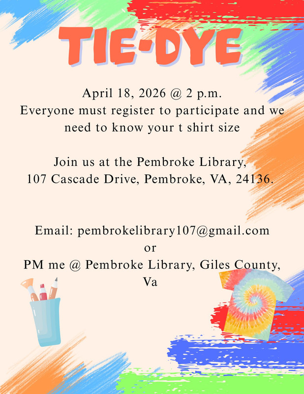 The Pembroke Library presents Create Tie-Dye on Saturday, April 18, 2026.