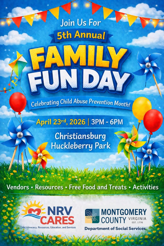 NRV Cares and the Montgomery County Department of Social Services presents the 5th Annual Spring Family Fun Day on Thursday, April 23, 2026 at the Christiansburg Huckleberry park.