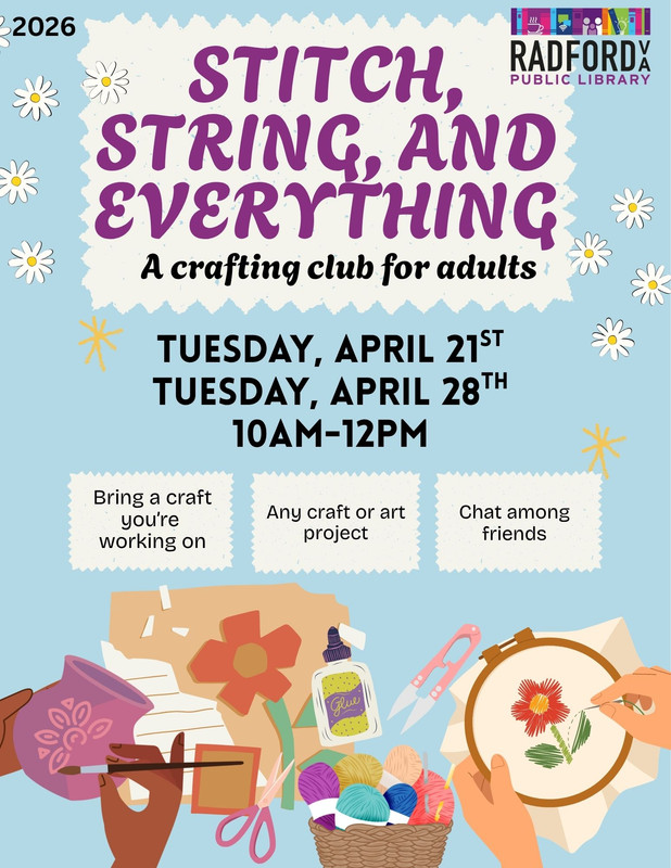 The Radford Public Library presents Stitch, String and Everything: A Crafting Club for Adults on Tuesday, April 21, 2026.