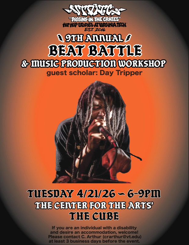 Hip Hop Studies at Virginia Tech presents the VTDITC vol 66: 9th Annual Beat Battle and Music Production Workshop on Tuesday, April 21, 2026 inside The Cube located within the Center for the Arts at Virginia Tech.