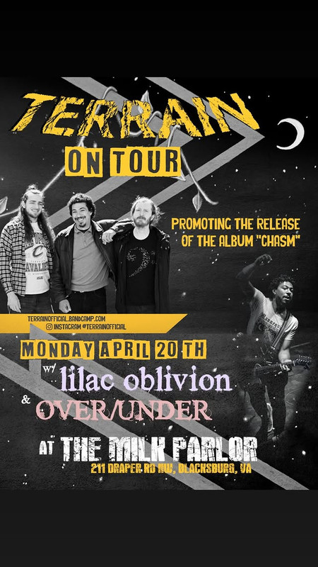 The Milk Parlor presents a Three Band Concert featuring Terrain on tour along featuring Lilac Oblivion and Over/Under on Monday, April 20, 2026.