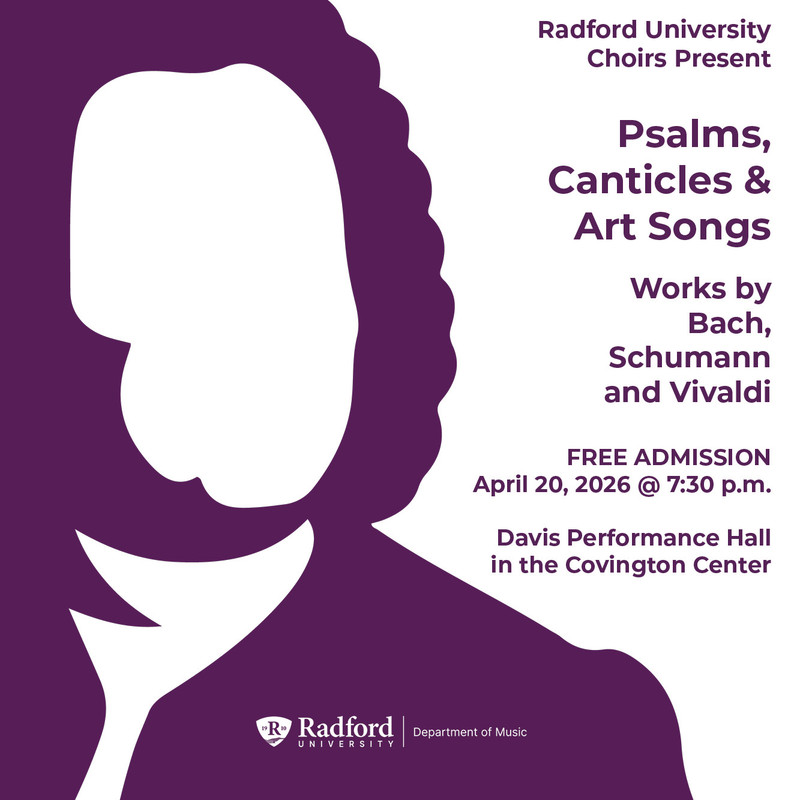 The Radford University College of Visual & Performing Arts presents the Radford University Choirs Spring Concert titled "Psalms, Canticles & Art Songs" on Monday, April 20, 2026 inside Performance Hall located within the Covington Center on the campus of Radford University.