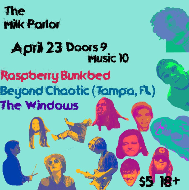 The Milk Parlor presents a Three Band Concert with Raspberry Bunkbed, Beyond Chaotic, as part of their Spring College Radio Tour, and The Windows on Thursday, April 23, 2026.