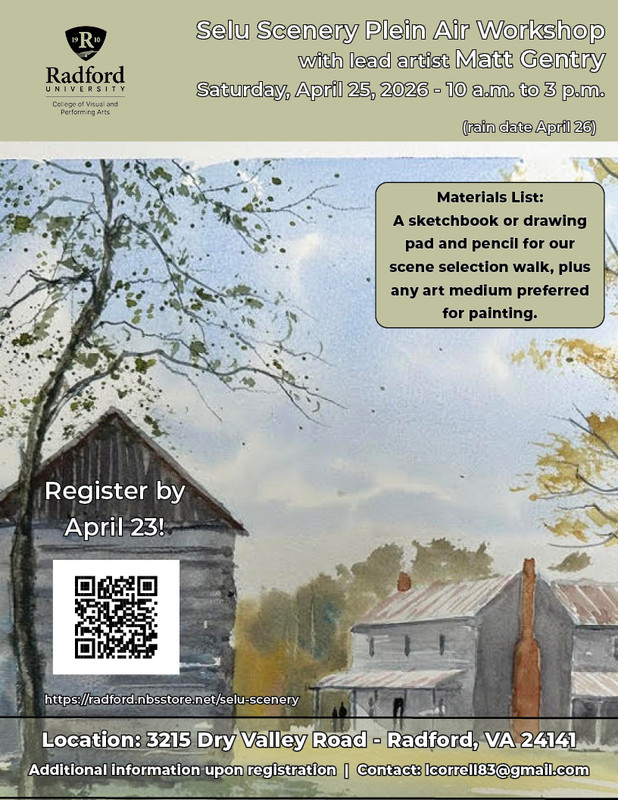 The Radford University College of Visual & Performing Arts continues their Selu Scenery Plein Air Workshop series with lead artist Matt Gentry on Saturday, April 25, 2026 from 10:00 AM to 3:00 PM with a registration deadline of Thursday, April 23, 2026 at Selu Conservancy in Radford, VA.
