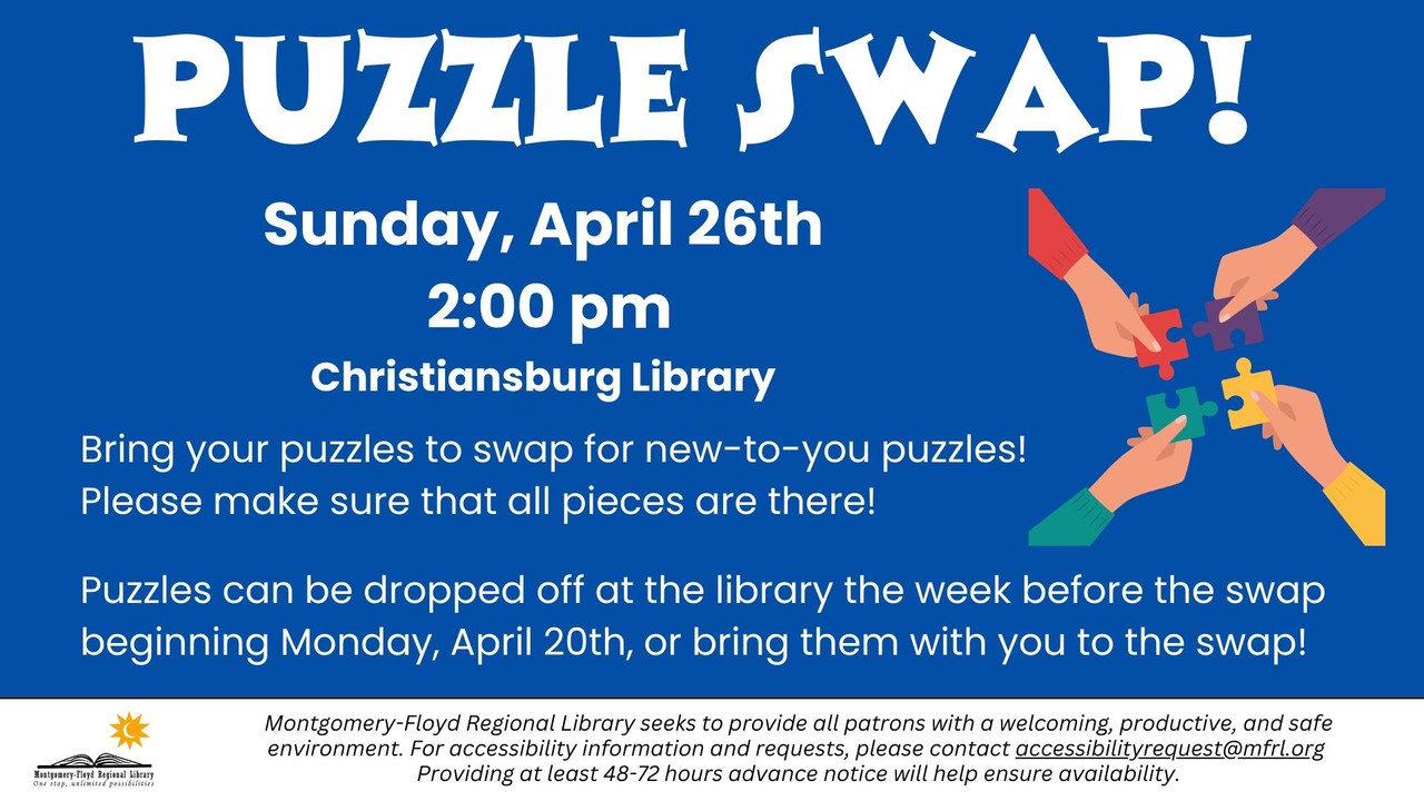 The Christiansburg Library presents a Puzzle Swap on Sunday, April 26, 2026.