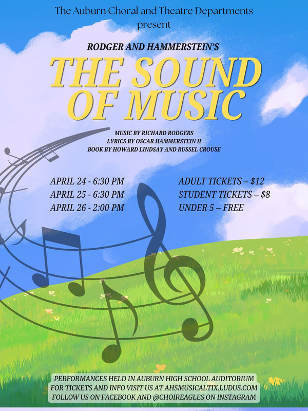 The Auburn Choral and Theatre Departments presents the musical by Rodgers & Hammerstein's "The Sounds Of Music" with three performance starting on Friday, April 24, 2026 through Sunday, April 26, 2026 at Auburn High School Auditorium.