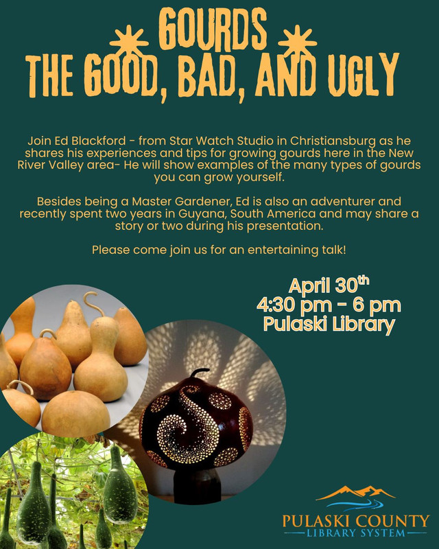 Join Ed Blackford, from Star Watch Studio in Christiansburg, VA, as he shares his experiences and tips for growing gourds here in the New River Valley area- He will show examples of the many types of gourds you can grow yourself.
