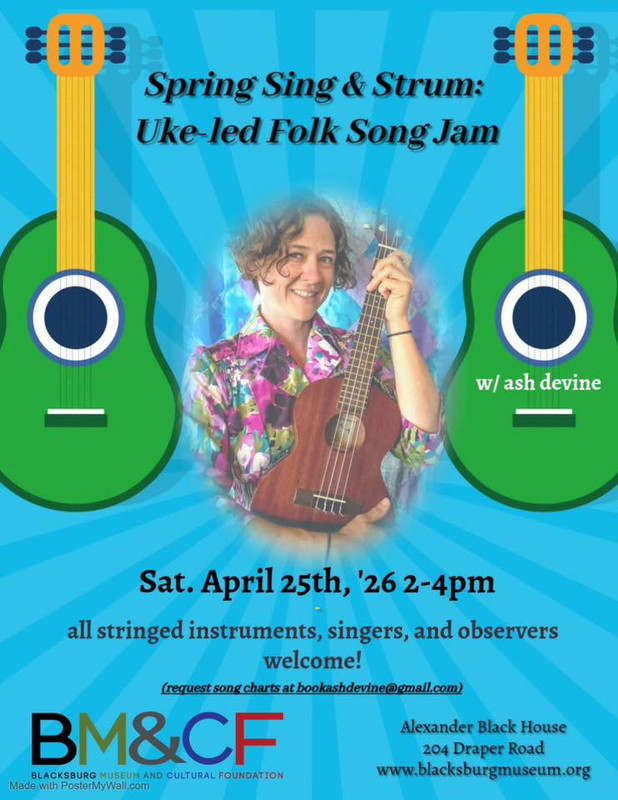 The Alexander Black House & Cultural Center presents the Spring Sing & Strum: Uke-led Folk Song Jam with Ash Devine on Saturday, April 25, 2026.