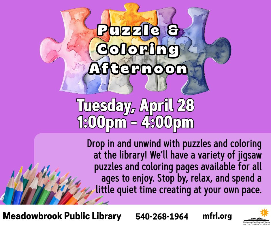 The Meadowbrook Public Library presents a Puzzle & Coloring Afternoon on Tuesday, April 28, 2026.