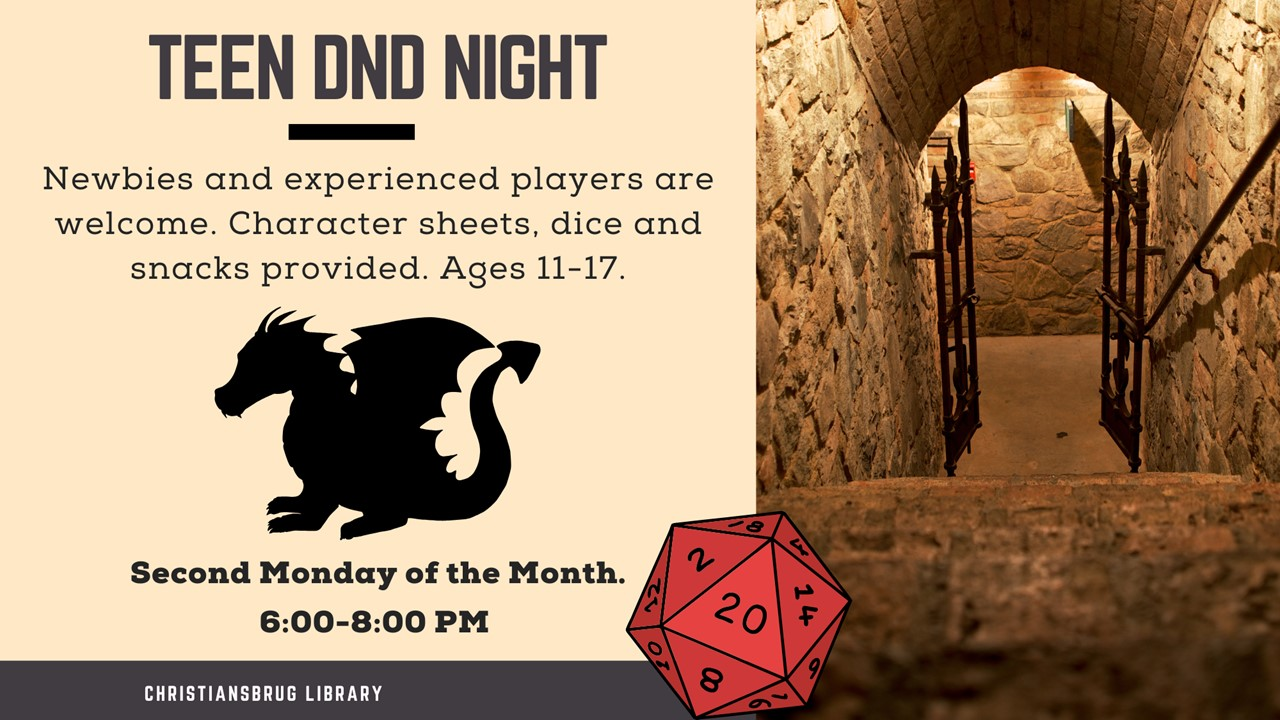 Christiansburg Library presents the November Teen Dungeons & Dragons Night on Monday, November 10, 2025.