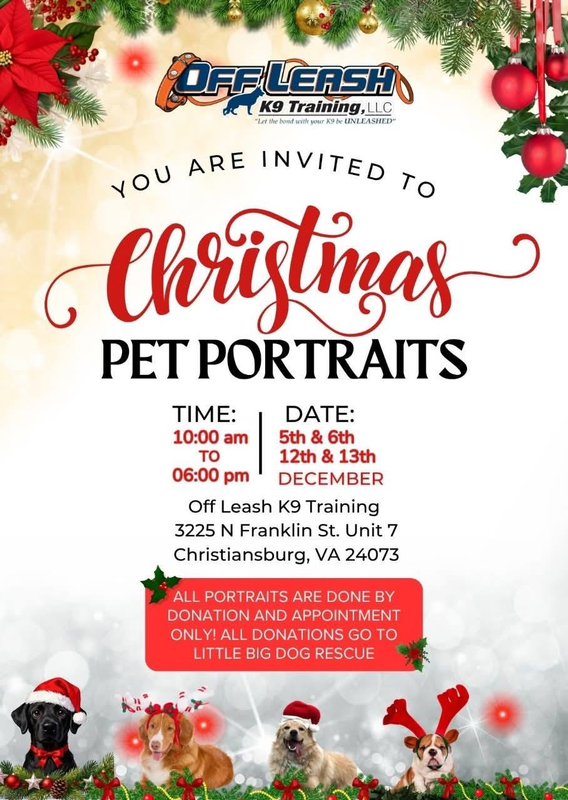 Off Leash K9 Blacksburg is offering their annual Christmas Pet Portraits again this year with all proceeds being donated to Little Big Dog Rescue.