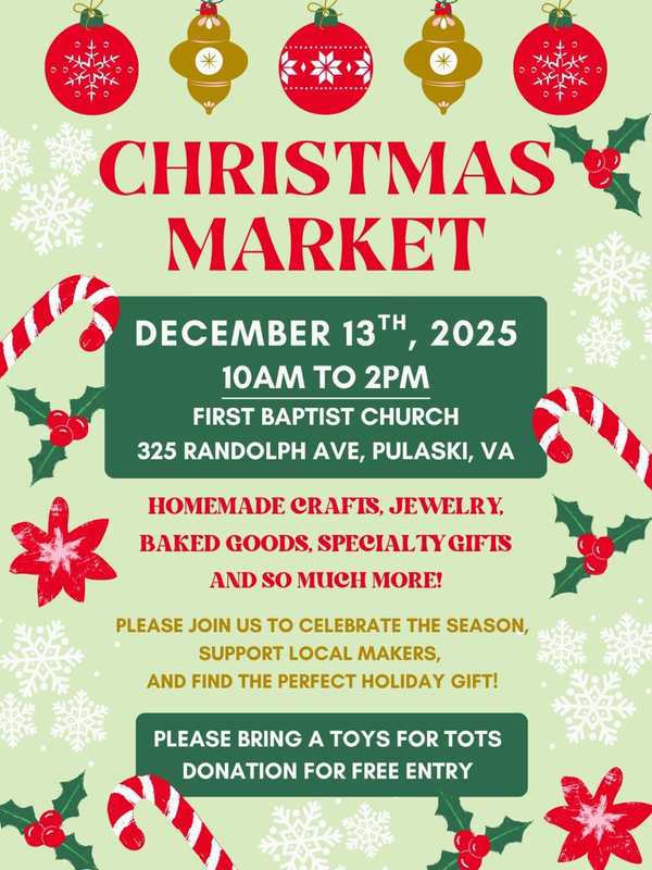 First Baptist Church Pulaski, VA presents their 2025 Christmas Market on Saturday, December 13, 2025.