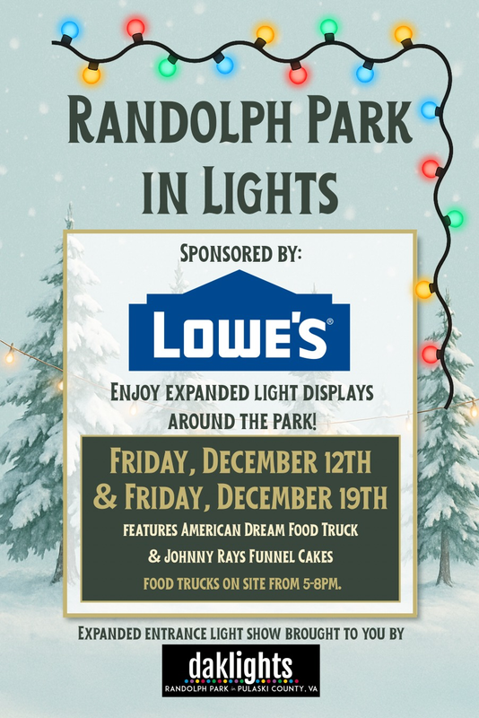 Pulaski County Parks & Rec, Pulaski Tourism and Pulaski County presents "Randolph Park in Lights" on Friday, December 12, 2025 and Friday, December 19, 2025 at Randolph Park in Dublin, VA.