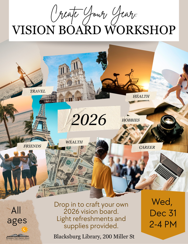 The Blacksburg Library presents Create Your Year: A Vision Board Workshop on Wednesday, December 31, 2025.