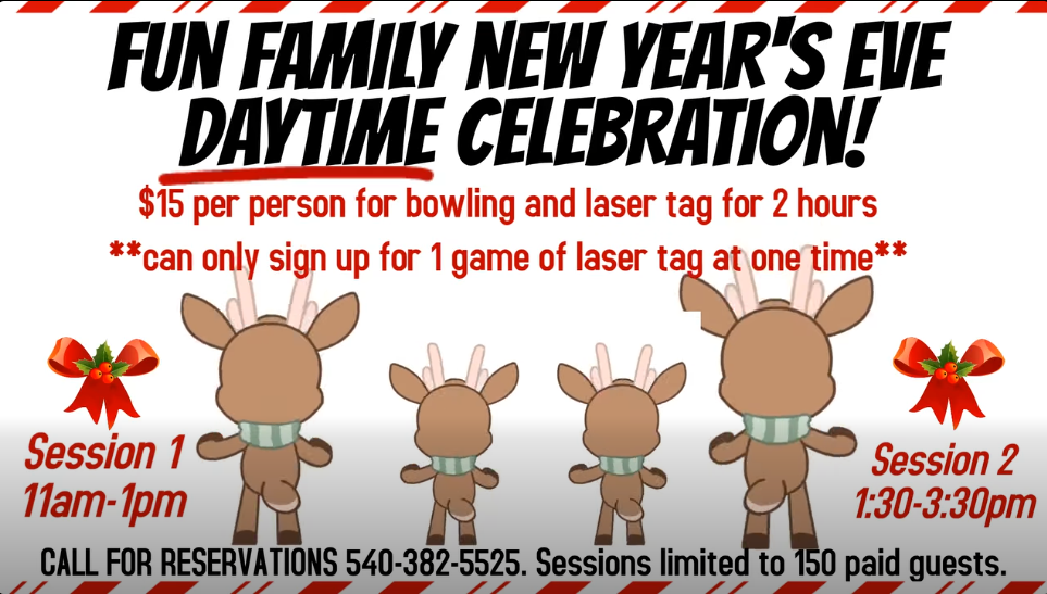 NRV Superbowl presents their Family New Year's Eve Daytime Celebration on Wednesday, December 31, 2025 with two sessions starting at 11:00 AM and 1:30 PM.