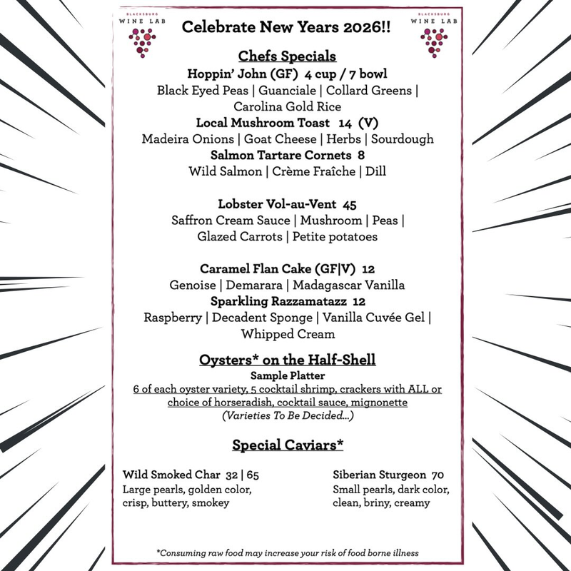 Ring in 2026 with a Global Celebration at Blacksburg Wine Lab! Join us for "Cheers Across Timezones" this New Year’s Eve as we toast to celebrations from around the world on our projector!