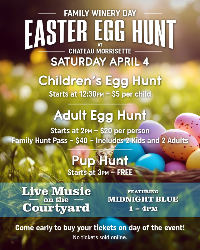 Chateau Morrisette presents their Family Winery Day with Easter Egg Hunts and live music from Midnight Blue on Saturday, April 4, 2026.