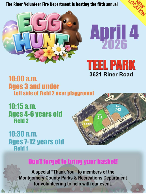 The Riner Volunteer Fire Department presents their 5th Annual Easter Egg Hunt on Saturday, April 4, 2026 at Teel Park in Riner, VA.
