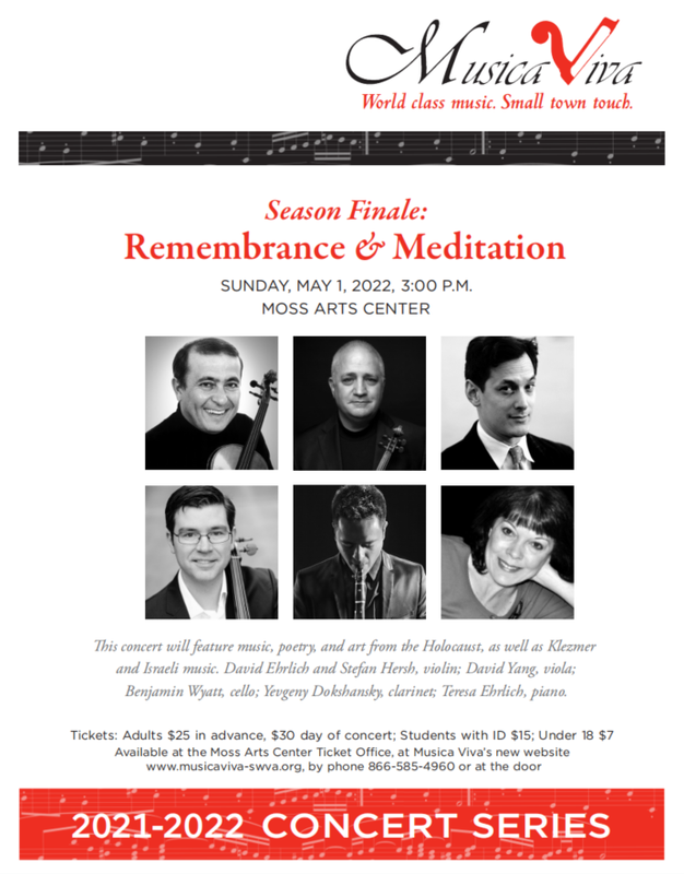 Musica Viva presents the season finale concert titled "Remembrance & Meditation" on Sunday, May 1, 2022 at the Moss Arts Center on the campus of Virginia Tech.