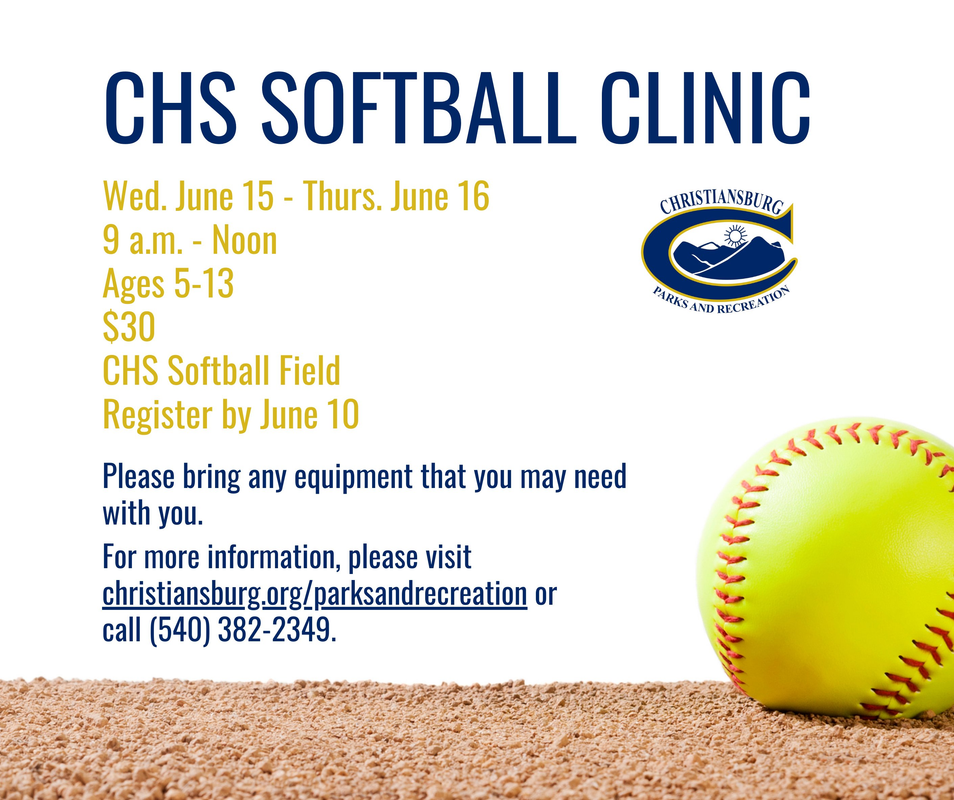 The Christiansburg Department of Parks and Recreation presents the two-day Christiansburg High Softball Clinic for ages 7-13 on Wednesday, June 15, 2022 and Thursday, June 16, 2022 from 9:00 AM to 12:00 PM daily at the Christiansburg High School Softball Field with a registration deadline of Friday, June 10, 2022.