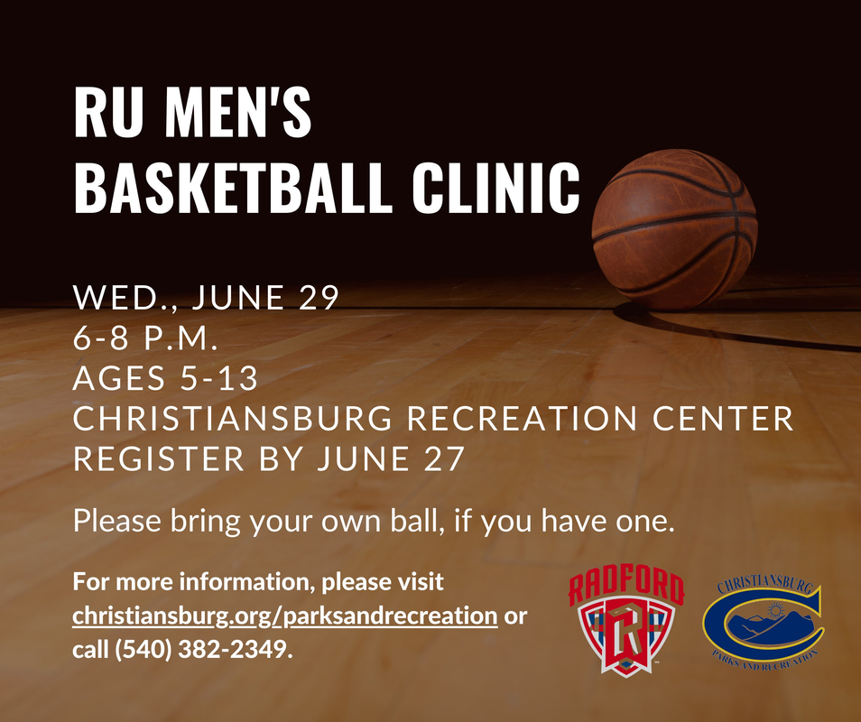 The Christiansburg Department of Parks and Recreation presents a Radford University Men's Basketball Clinic for ages 5-13 on Wednesday, June 29, 2022 at the Christiansburg Rec Center with a registration deadline of Monday, June 27, 2022.