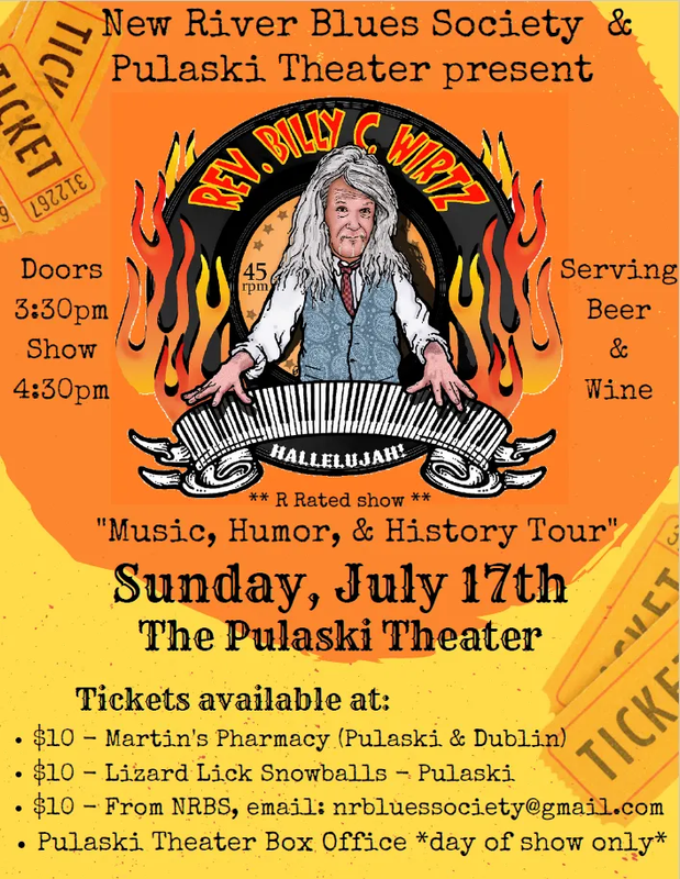 The New River Blues Society presents the Reverend Billy C. Wirtz performing as part of his Music, Humor, and History Tour on Sunday, July 17, 2022 at the Pulaski Theatre.