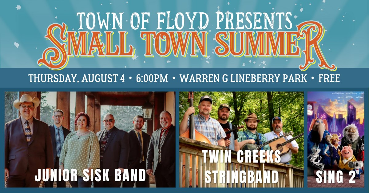 The Town of Floyd continues its 5th Annual Floyd Small Town Summer series featuring music from the Junior Sisk Band and the Twin Creeks Stringband on Thursday, August 4, 2022 outside at Warren G. Lineberry Memorial Park.