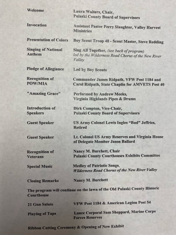 The Pulaski County Courthouse Exhibits Committee, Pulaski County Board of Supervisors, and Pulaski County Veterans’ Organizations cordially invite you to a Veterans Salute and Remembrance Ceremony.