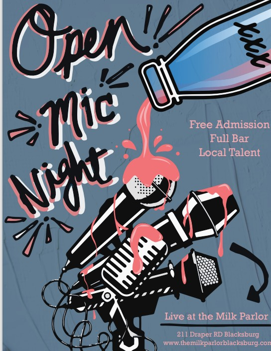 Open Mic Night Venue:The Milk Parlor, Blacksburg Directions:Google Map Link Date: Friday, July 1, 2022 Time: 6:00 - 9:00 PM Event Types: Music Cost: Free