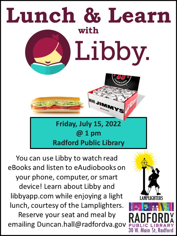 Radford Public Library presents a Lunch & Learn with Libby on Friday, July 15, 2022.