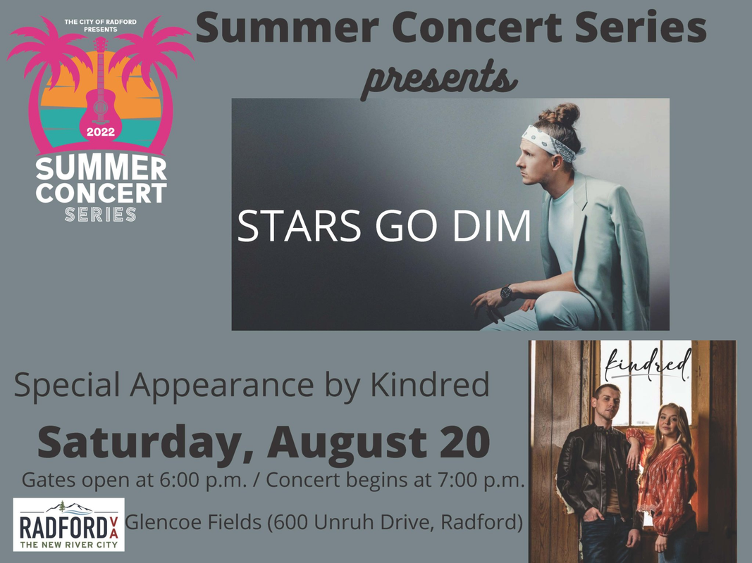 The City of Radford and the Radford Chamber of Commerce continues the 2022 Summer Concert Series featuring Stars Go Dim with Kindred in concert on Saturday, August 20, 2022 on the Glencoe Mansion, Museum & Gallery lower field in Radford, VA.