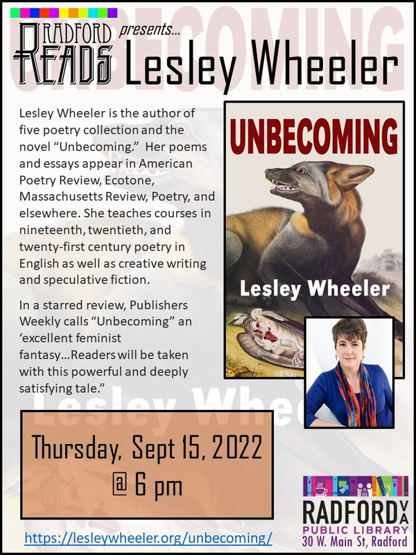 Radford Public Library presents a Radford Reads event with Author & Poet Lesley Wheeler on Thursday, September 15, 2022.