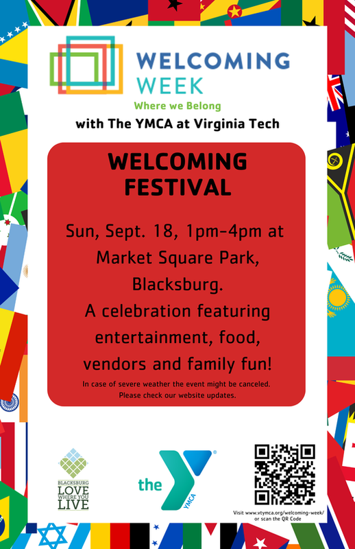 The YMCA at Virginia Tech concludes their Welcoming Week events with the 2022 Welcoming Festival on Sunday, September 18, 2022 at Market Square Park in downtown Blacksburg, VA.