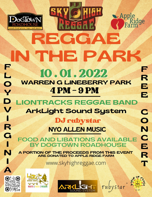 Join us in beautiful Warren G Lineberry Park in downtown Floyd VA for Sky High's biggest fundraising event of the year. Liontracks Reggae Band will be performing along with DJ rubystar and the debut of local teen reggae project, NYO Allen Music and ArkLight Sound System.