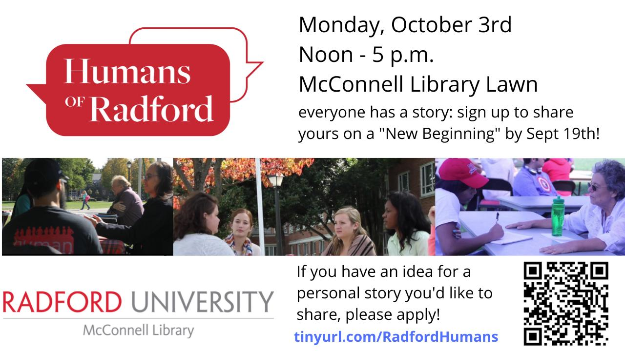 Attendees engage in authentic conversations to promote understanding, challenge preconceptions, and encourage mutual respect. This year’s theme is "New Beginnings". If you have a personal story that deals with beginning something, shifting your perspective, or a change in your life that meant a fresh start, we would love to hear from you. This is your chance to share your experiences with fellow members of the Radford University community. If the theme leaves you puzzled, sign up to share a personal story of your choosing!