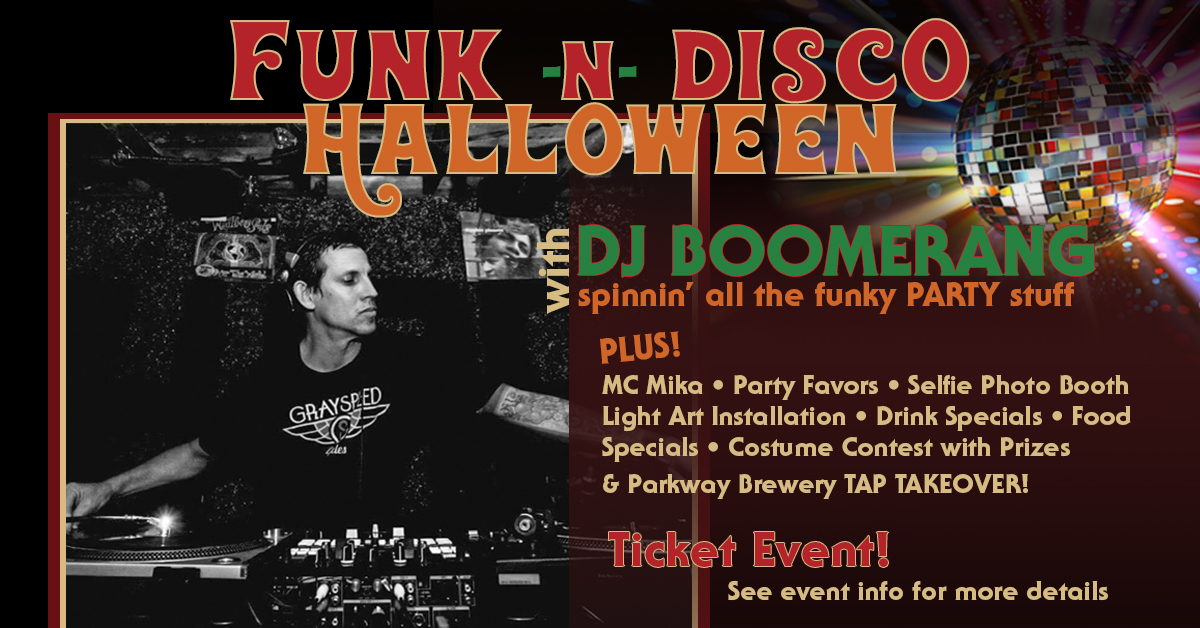 Get funky with us this Halloween! Get dressed up funky disco style and let loose with one of the areas finest DJ’s in DJ Boomerang spinning all the funk party stuff, and the awesome MC Mika to lead the night!
