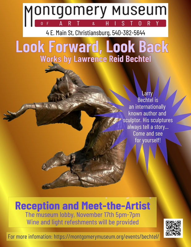 We hope you will join us to celebrate the opening reception and meet-and-greet for Lawrence "Larry" Bechtel, an internationally known author and sculptor. His sculptures always tell a story. Bechtel beautifully weaves art and history together to produce amazing sculptures that have captivated audiences for years. Many of his works can be found on the campus of Virginia Tech, including Addison Caldwell (Walking Toward the Light) and That I May Serve (Virginia Police Dog Sculpture). Each piece tells an intricate and compelling story that speaks to our history.