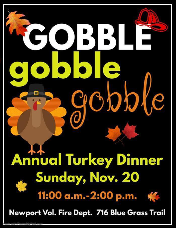 Newport Volunteer Fire Department presents their Annual Turkey Dinner on Sunday, November 20, 2022.