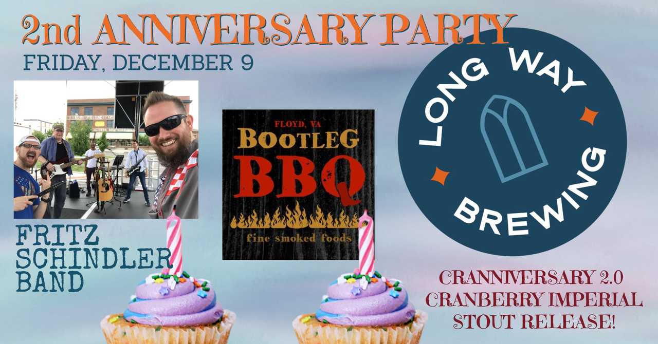 Long Way Brewing presents their 2nd Anniversary Party with Music from the Fritz Schindler Band on Friday, December 9, 2022.