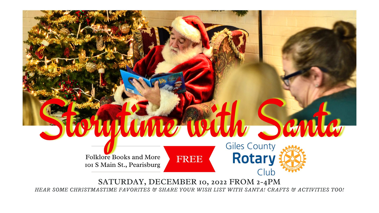 The Giles County Rotary Club and Folklore Books and More presents the 3rd Annual Storytime with Santa on Saturday, December 10, 2022 at Folklore Books in Pearisburg, VA.