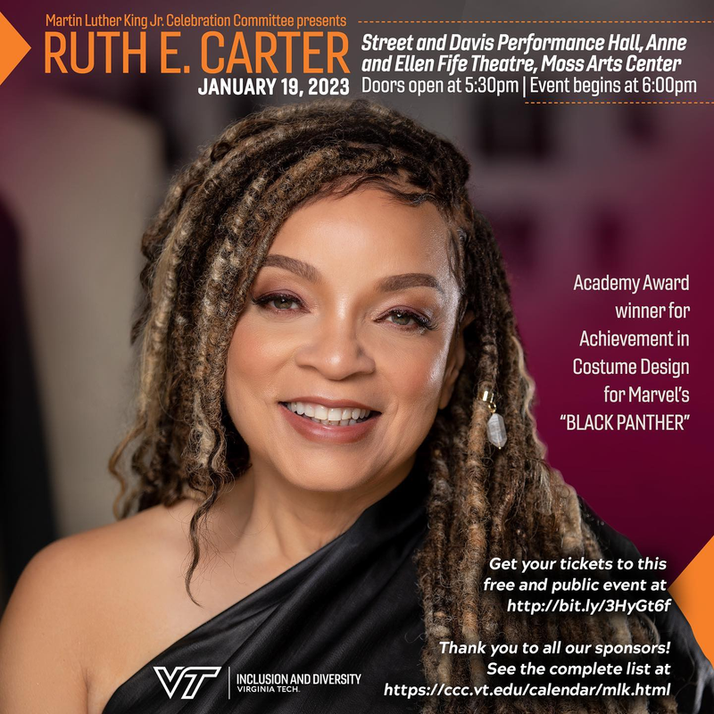 As part of the 2023 Martin Luther King, Jr. Celebration, Virginia Tech presents A Conversation with Ruth E. Carter on Thursday, January 19, 2023 at the Moss Arts Center at Virginia Tech.