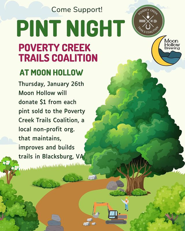 Moon Hollow will donate $1.00 from every pint sold to the Poverty Creek Trails Coalition, a local non-profit organization that maintains, improves and builds trails in Blacksburg, VA.