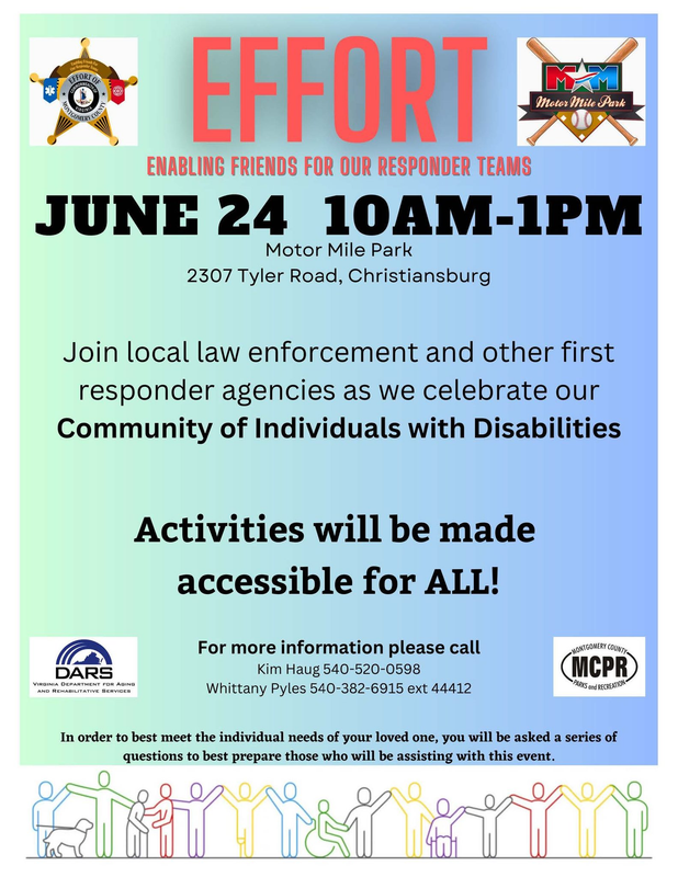 Montgomery County Parks and Recreation and local law enforcement and first responders presents "EFFORT Day 2023", a Celebration of Community of Individuals with Disabilities, on Saturday, June 24, 2023 at the Motor Mile Baseball Complex.
