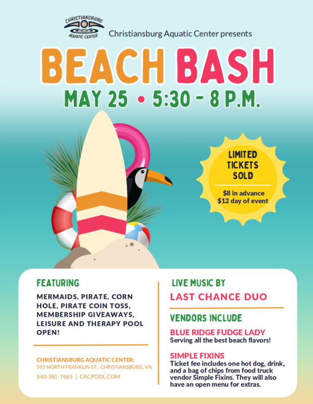 The Christiansburg Aquatic Center presents their 2023 Beach Bash on Thursday, May 25, 2023.