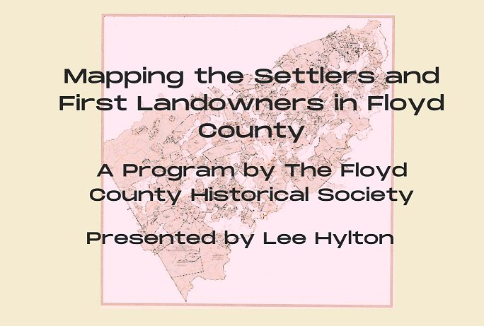 The Floyd County Historical Society presents the historical program "Mapping the Settlers and First Landowners in Floyd County" on Saturday, May 13, 2023 at The Floyd Center for the Arts.