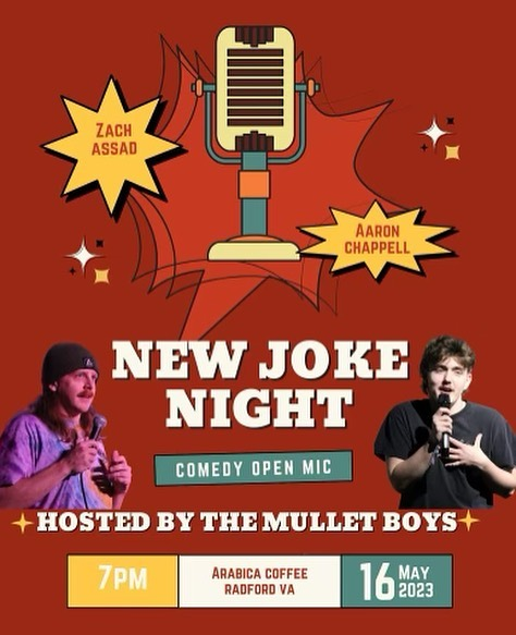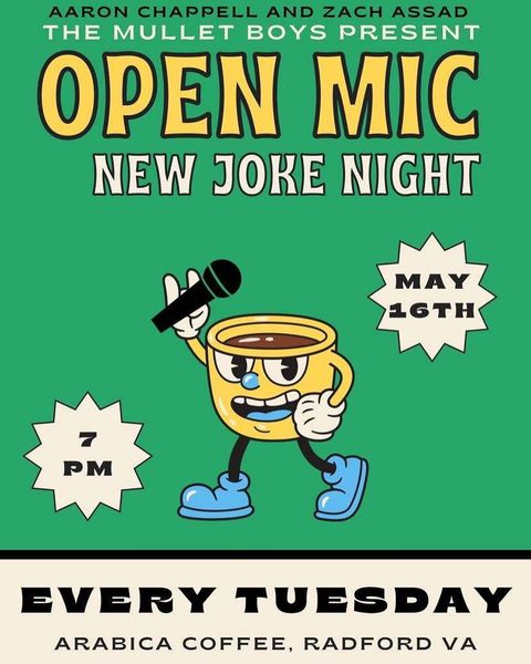 The Mullet Boys presents their first Comedy Open Mic New Joke Night on Tuesday, May 16, 2023 at Arabica Cafe in Radford, VA.