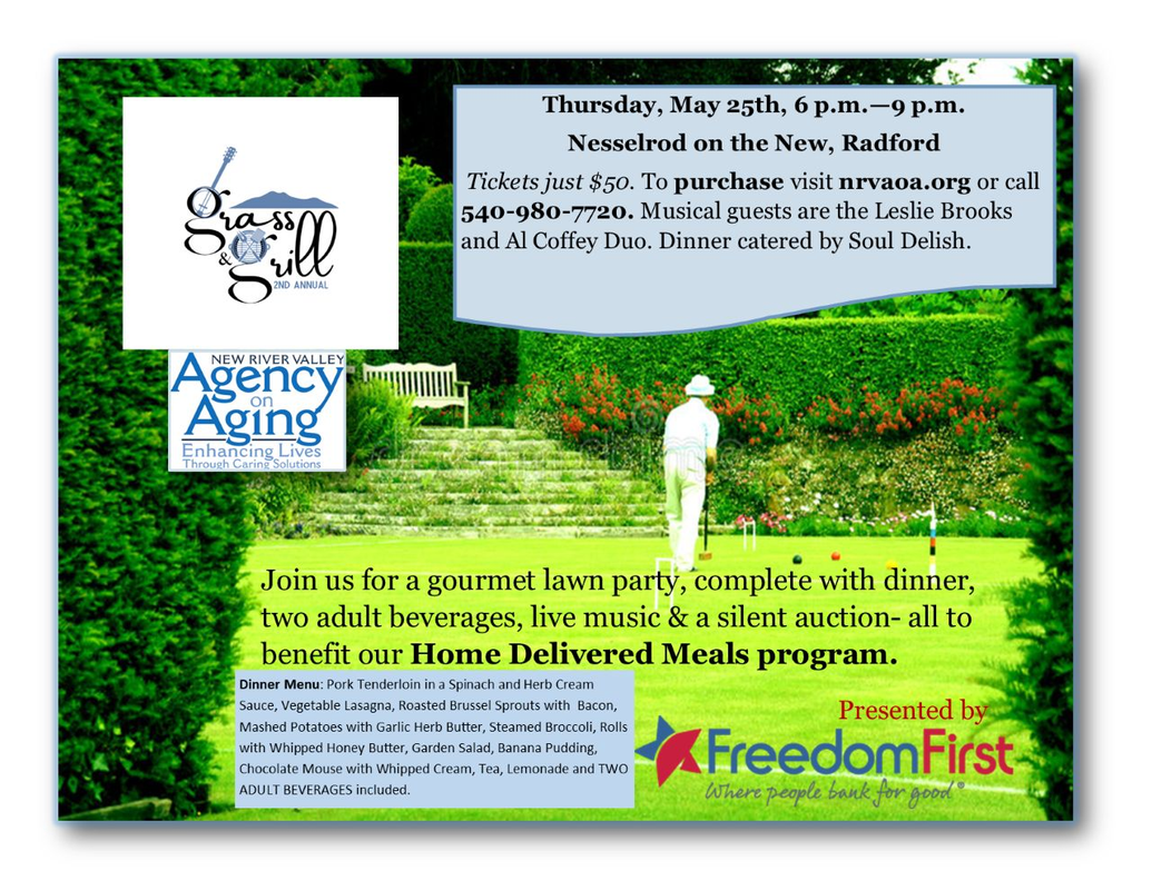 The New River Valley Agency on Aging presents the 2nd Annual Grass & Grill on Thursday, May 25, 2023 at Nesselrod on the New in Radford, VA.