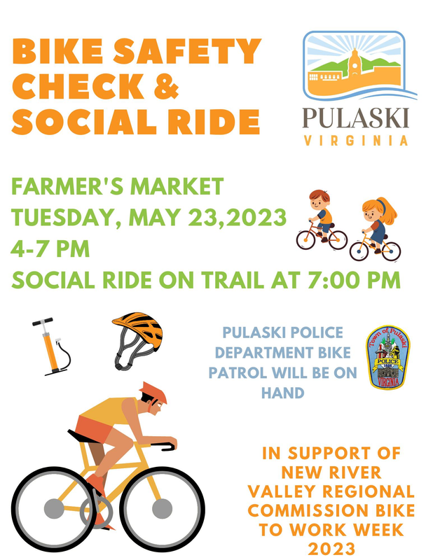 Get your bike checked out by the Town of Pulaski Outdoor Facilities Coordinator and hang out with members of Pulaski Police Department Bike Patrol. There will also be a Social Ride on the trail starting at 7:00 PM. Open to bicyclists of all ages and skill levels.