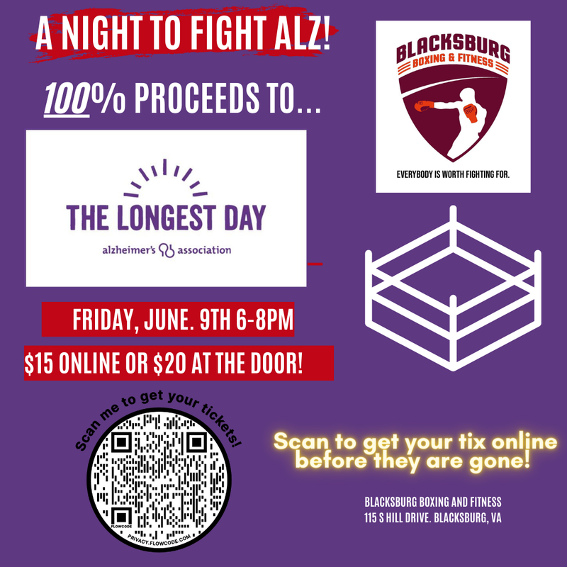 Blacksburg Boxing and Fitness presents A Night To Fight Alzheimer’s on Friday, June 9, 2023.
