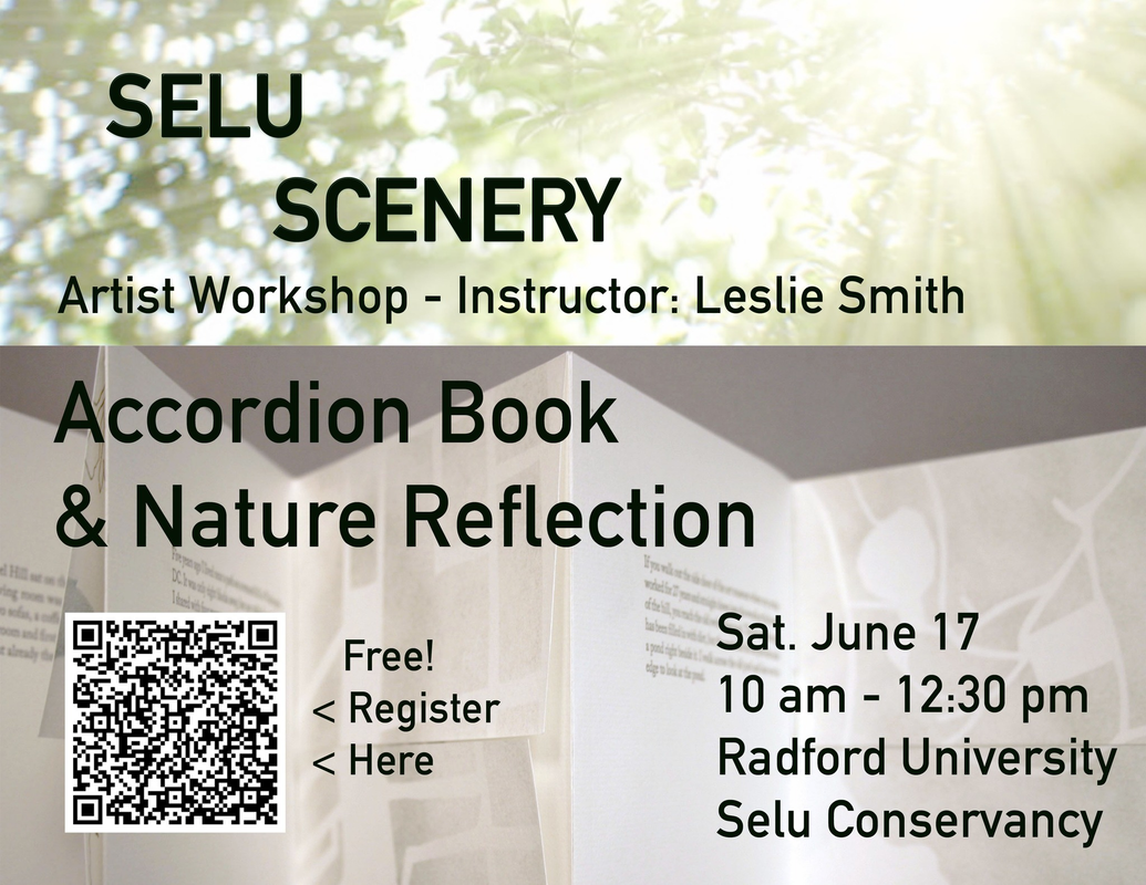 The Radford University College of Visual & Performing Arts continues their Plein Air Workshop Series with "Accordion Bookmaking & Nature Reflection" on Saturday, June 17, 2023 at Selu Conservancy in Radford, VA.